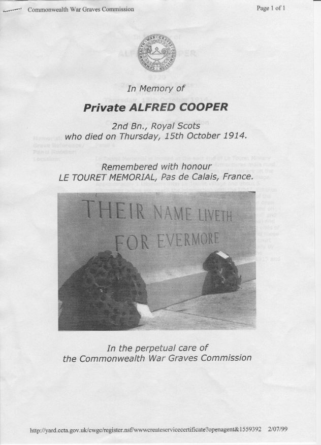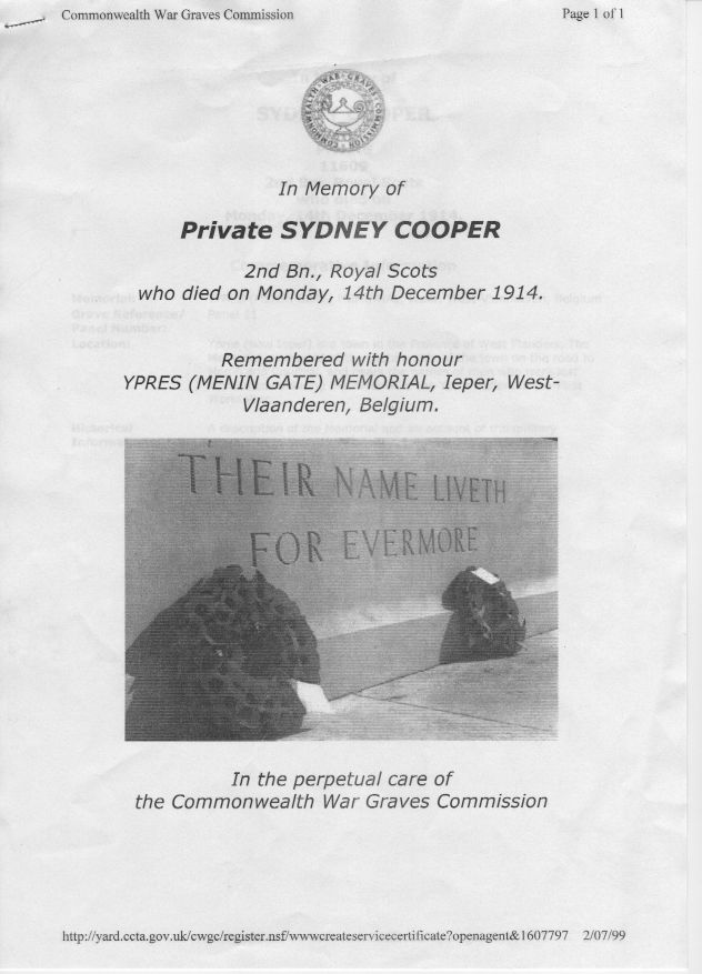 Born circa 1891 in Anerley, Surrey. He joined the Royal Scots Regiment in World War I with his brothers, Alfred William and Sidney, but unlike them he managed to survive. He married Mary Agnes Sharp (born 1905) and they had a son, Malcolm Cooper, who was born on 29 July 1947.